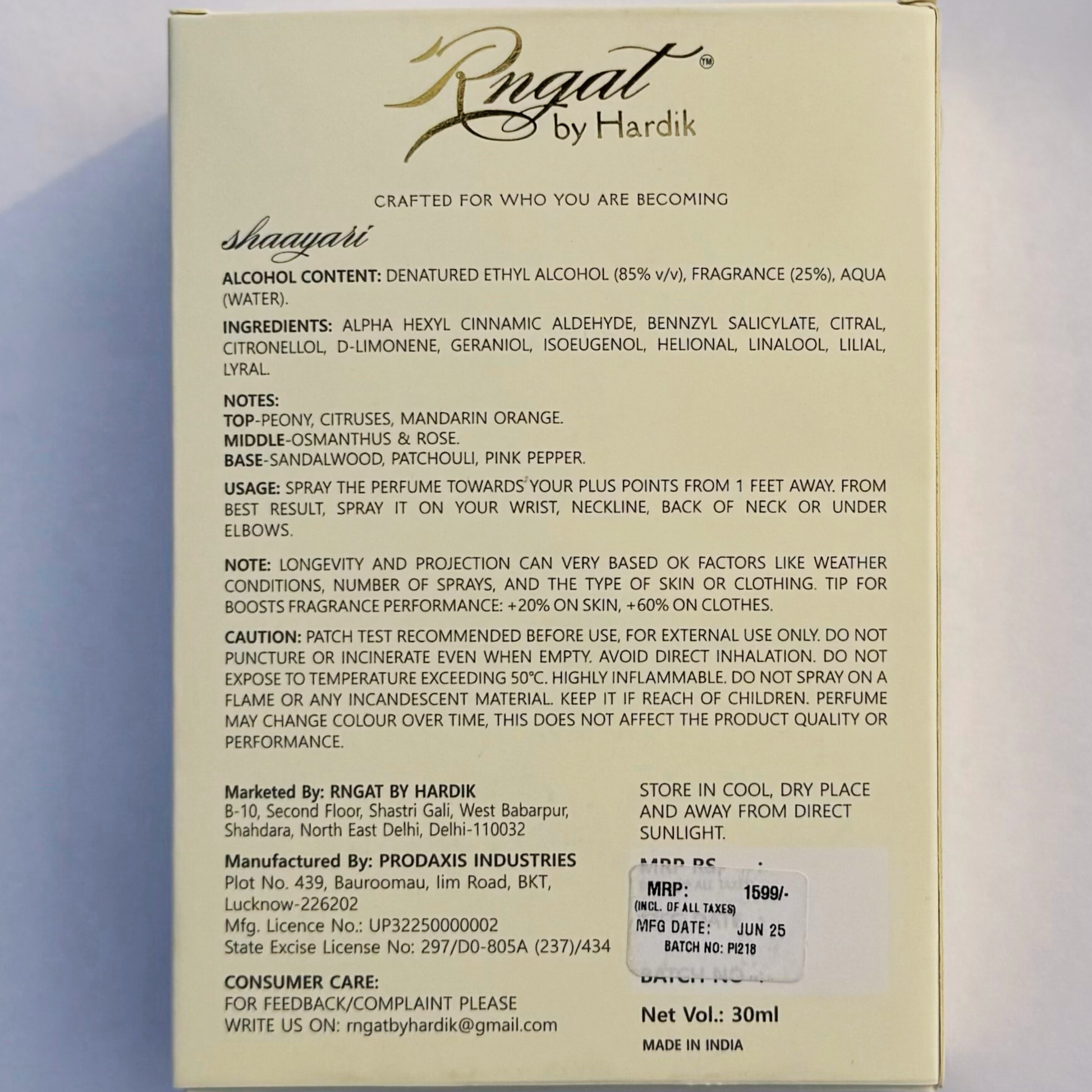 Shaayari blooms with peony, citrus, and mandarin, flows into osmanthus and rose, and settles into a warm base of sandalwood and patchouli.